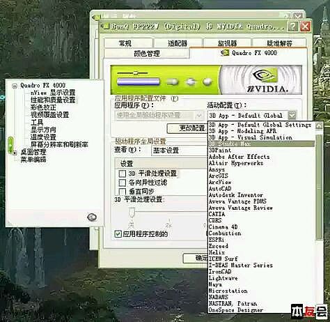 作為對比,我們來看更復(fù)雜的模型在專業(yè)顯卡上的表現(xiàn),圖1是NV的Quadro FX 4000顯卡的驅(qū)動設(shè)置畫面,可以看到,驅(qū)動中內(nèi)置了大量已經(jīng)做好的專門針對專業(yè)3D設(shè)計軟件優(yōu)化的配置,其中包括普通用戶也很熟悉的3Ds Max、AutoCAD、Lightwave、Maya等等。