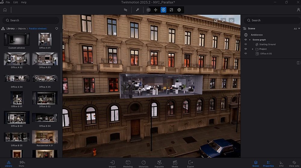 Twinmotion 2025.2 新增的 視差窗口 (Parallax Window),通過(guò)特殊著色器技術(shù),在無(wú)需復(fù)雜幾何體的情況下即可營(yíng)造出逼真的室內(nèi)空間縱深感。