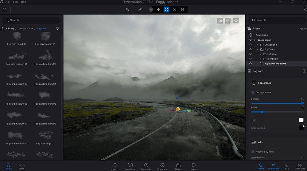 同時(shí),新增的 17種動(dòng)畫霧效卡片 讓用戶只需拖放即可為場(chǎng)景添加氤氳霧氣。霧效響應(yīng)風(fēng)向與風(fēng)速變化,性能開(kāi)銷極低,是快速塑造氛圍的理想工具。