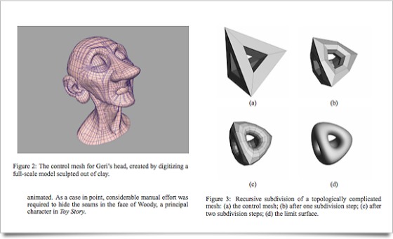 托尼•德瑞斯對CG動畫制作界最為重要的貢獻(xiàn),就是引入了高還原度的曲線/曲面的生成算法:如何將復(fù)雜的形狀分解成電腦可以生成的多邊形。多年以來,電腦動畫和電子游戲制作都在致力于用多邊形來表示一個真實世界的三維物體。但是,使用多邊形的問題就在于,仔細(xì)一看,還是看得出來多邊形的棱角的。CG業(yè)界的趨勢是用“平滑”曲面代替多邊形,這些“平滑”曲面會經(jīng)過原來多邊形頂點所在的位置。數(shù)學(xué)家針對此方,發(fā)明了各種快速生成“經(jīng)過固定點的‘平滑’曲面”的方法。