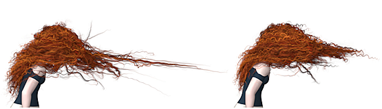 卷發(fā)絲模擬中用彈簧彎曲對比不用彈簧彎曲,在受力之后3幀的區(qū)別。來源:Pixar