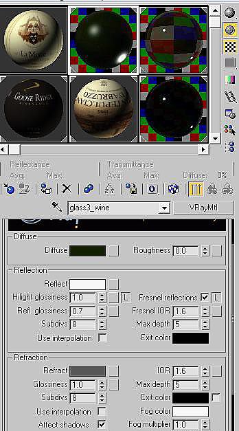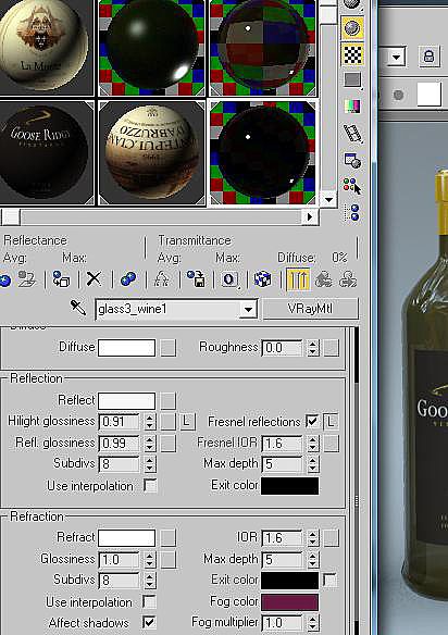 這是右邊的酒瓶,紅酒,有那么一點點的透明,而且玻璃本身是由顏色的。參數(shù)研究如上圖。主要是用了Fog Color的特性來調(diào)試。