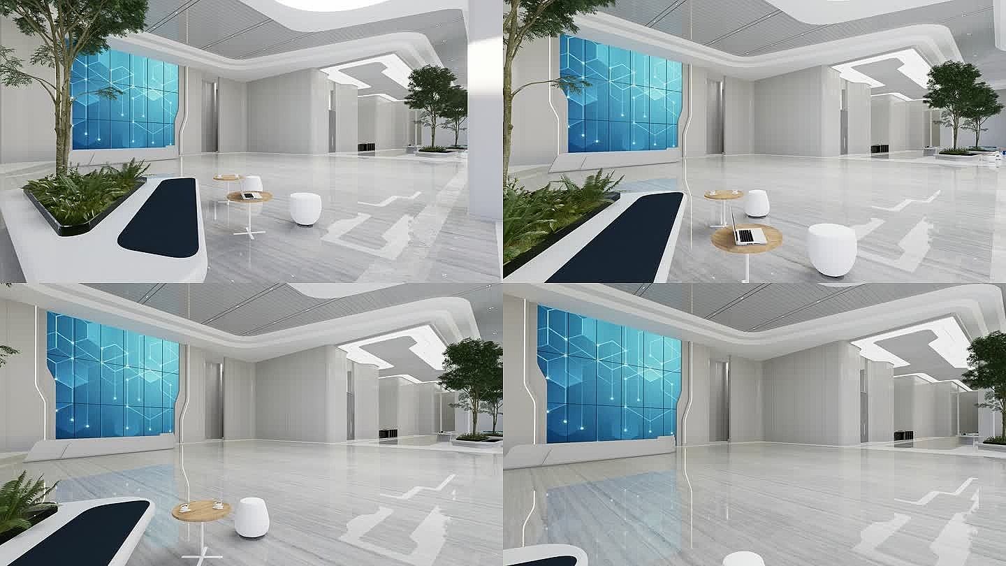 科技感辦公樓大堂前廳到電梯漫游三維動(dòng)畫鏡頭